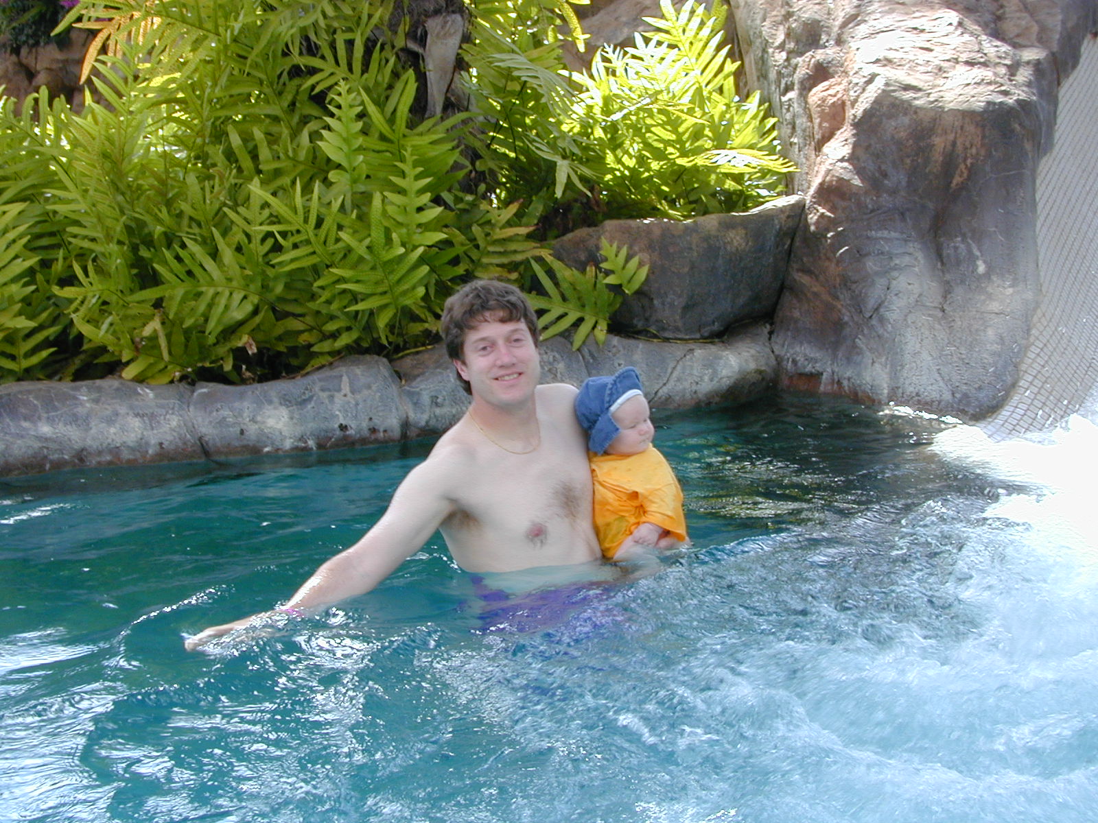 Dad's playing in the deeper water. Scott eyes the water slide. Maybe that's fun?