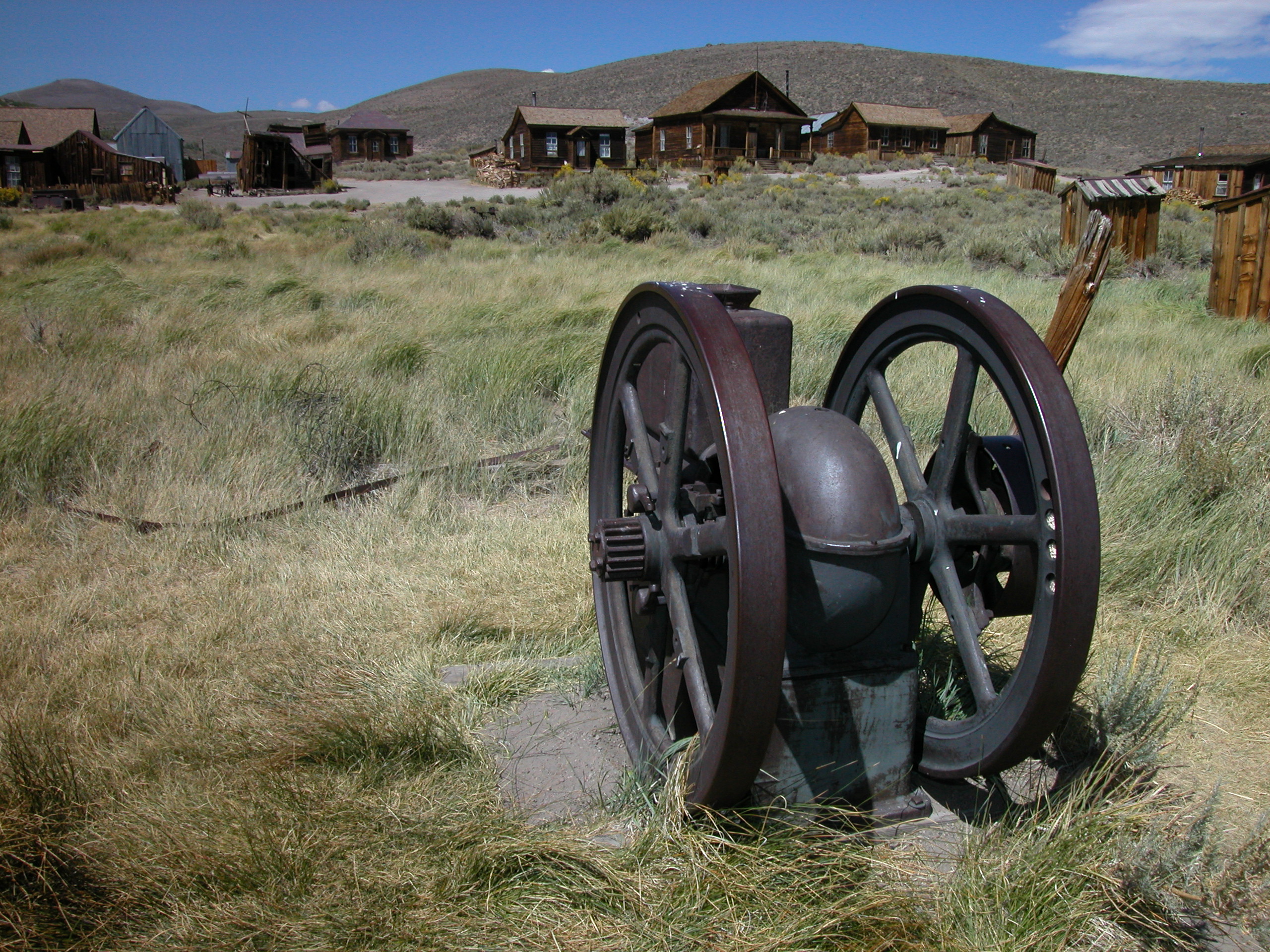 Bodie is a well-preserved gold-mining ghost town in the middle of nowhere, about an hour from June Lake. Antique machinery such as this steam engine were strewn about.