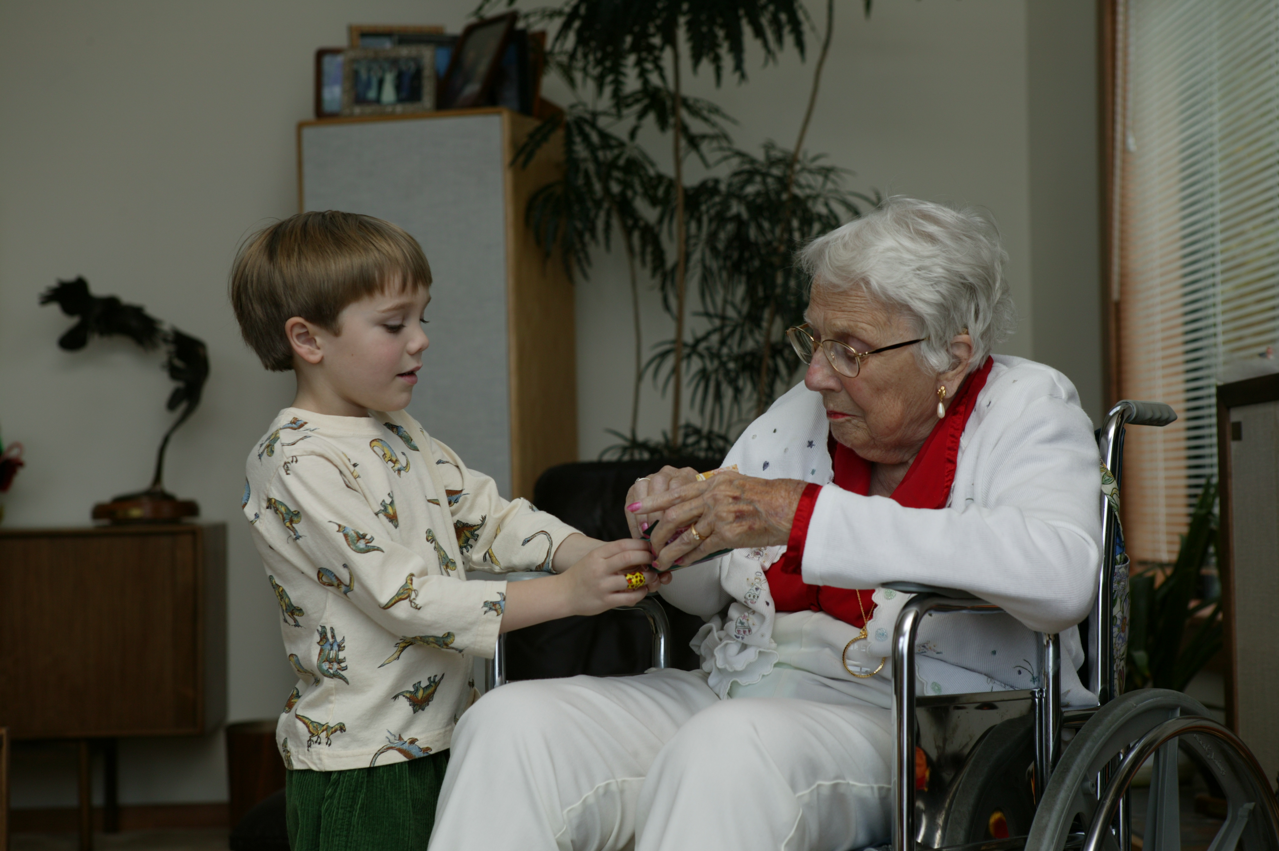 John helps great grandma open a present.
